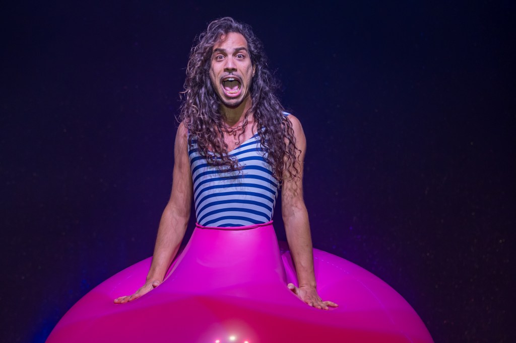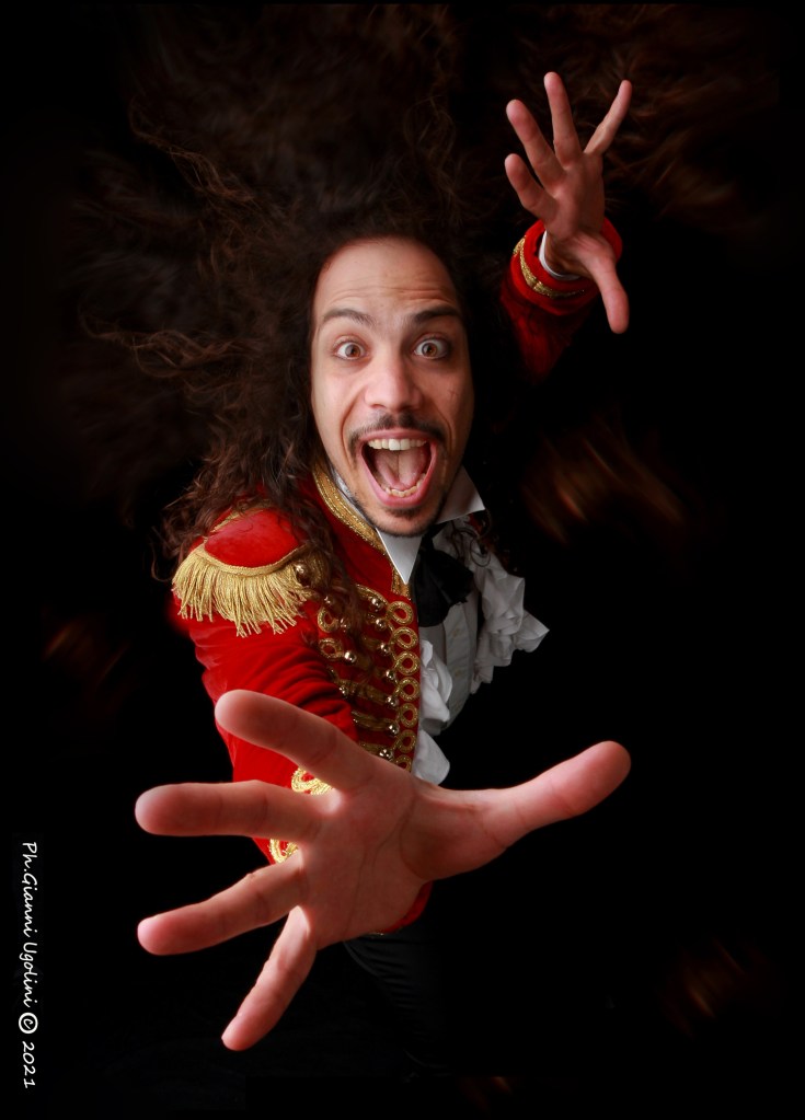 His unique character blurs the line between rock star and joker, his character adapts cleverly into a wide variety of theatrical events, which include, exclusive clubs, International Varietè theaters, theme parks, conventions halls and also stadiums.